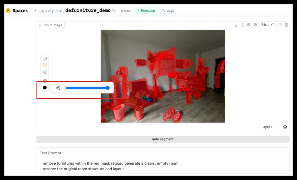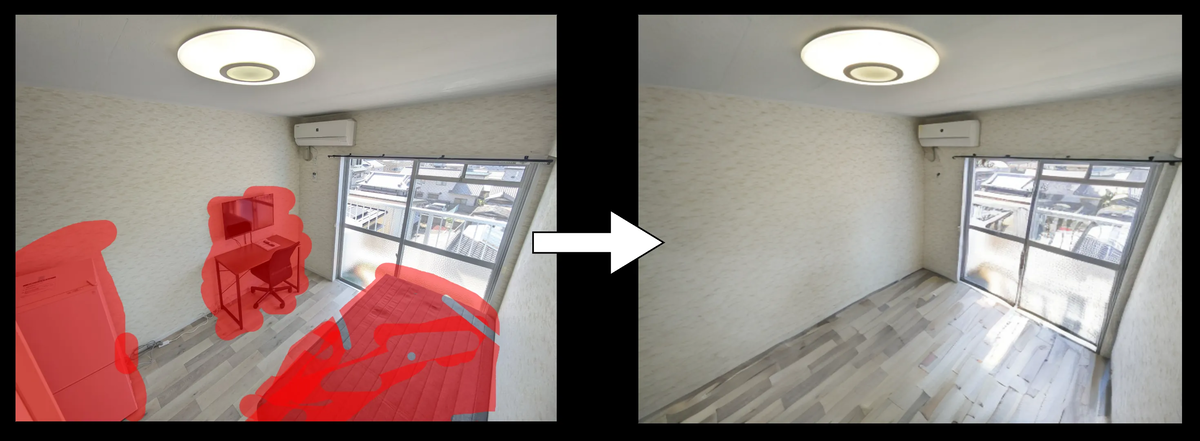 床材・壁面の不連続性: 除去範囲の境界で質感や模様が不自然に変化する、また、ユーザーが手動で作成するマスク領域は完璧ではなく、おおまかな範囲指定になることが多いという実用上の課題もありました。